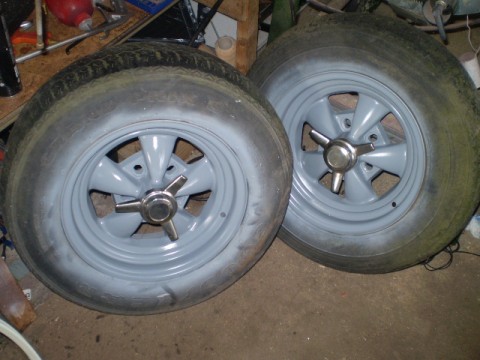 A few piccies i took this evenin after washin the crusty. The plastic under the front end is an old tarp that the missus made me put down in case it leaked on her new driveway..... Ive also laid new carpet inside and jazzed the standard steerin wheel up a little as it was plain boring black. Ive managed to get a pair of wheels which ive primed ready for paintin (no i didnt mask the tyres cos theyre knackered an comin off). Can anyone else supply a similar pair??? 5x5 stud pattern. Happy with unilug as its what this pair has.